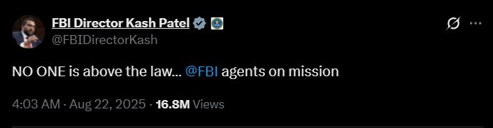 On August 22, at 4:03 a.m. yesterday, Kash Patel jumped on X.com and dropped his little “bombshell.” He thought he was making history. What he was really doing was proving how middle-school petty dictatorship always starts.